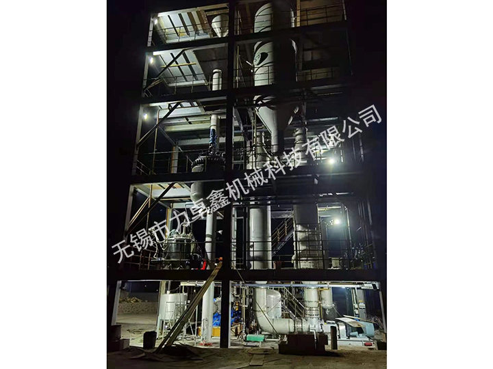 工作原理:四效降膜蒸發(fā)器需濃縮的料液由泵送入加熱管頂部,沿著加熱管內(nèi)壁形成液膜向下流動。在這個過程中,由于管外的加熱,管內(nèi)液膜開始沸騰并部分蒸發(fā)